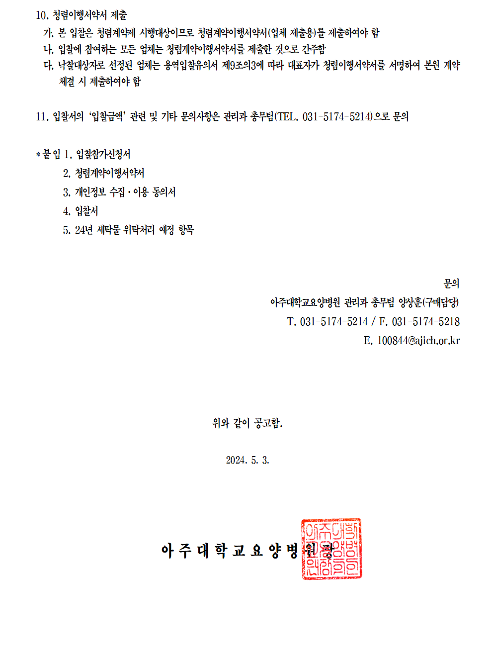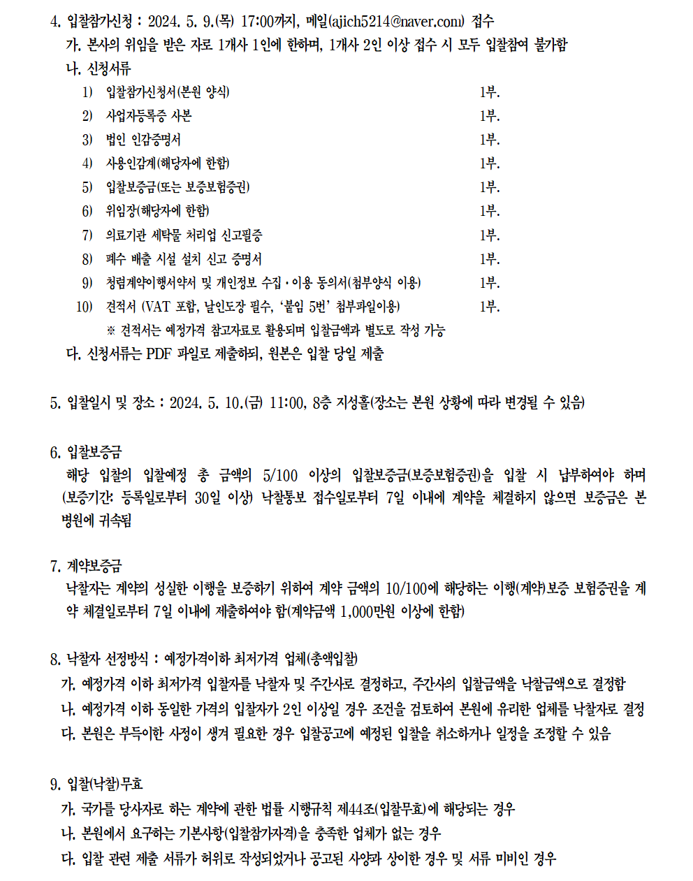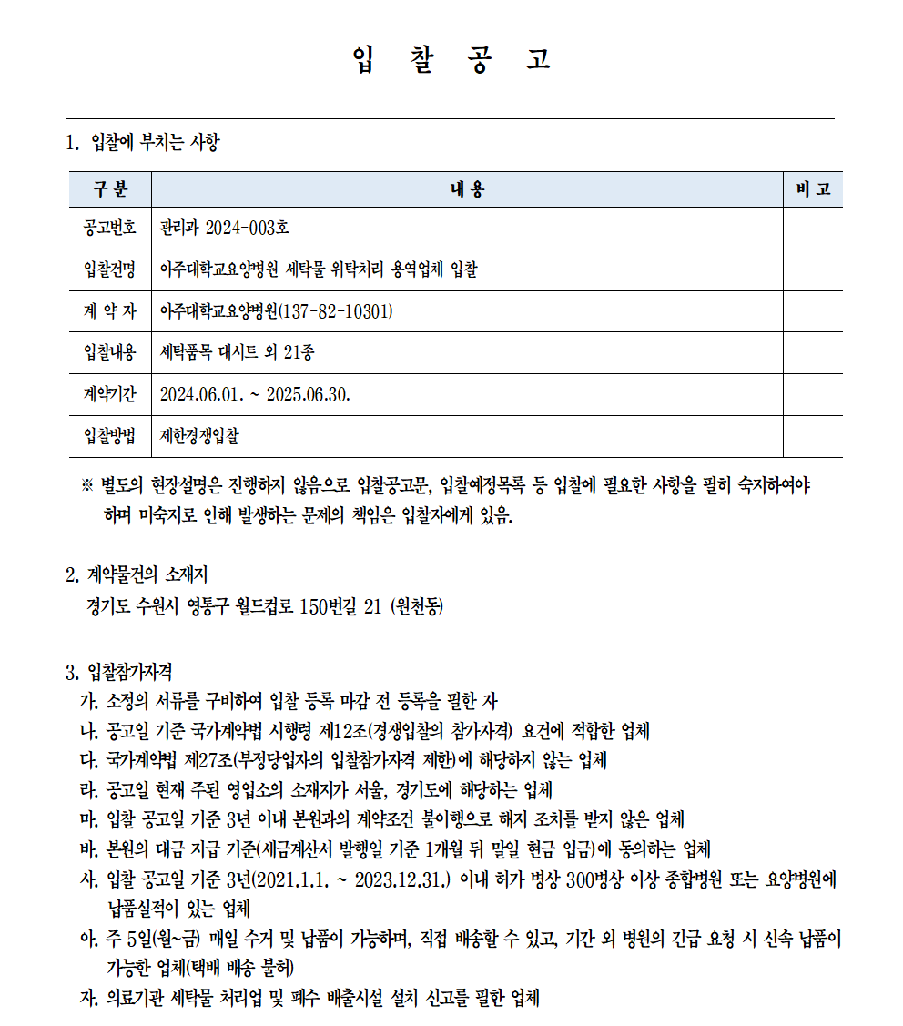 2024-05-03발주처 : 아주대학교요양병원입찰방법 : 제한경쟁입찰