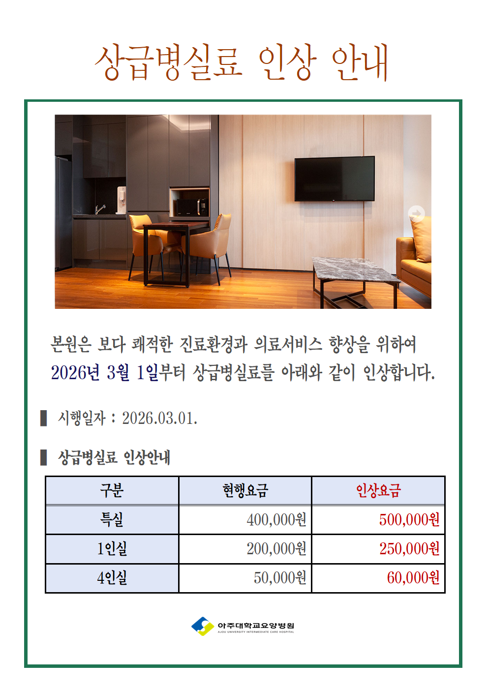 아주대학교요양병원은 회복기 재활치료와 암 재활이 필요한 환자를 중심으로 아주대학교병원과 지역사회를 연계한 다양한 치유·회복 프로그램을 운영하여 특성화된 요양의료서비스를 제공함으로서 지역사회와 환자 회복을 위한 재활의료 전달체계를 구축하고자 합니다. 아주대학교요양병원은 2030년까지 대한민국 회복기재활과 암재활의 거점 의료기관으로 성장하고, 지역사회 연계를 통한 통합의료시스템을 구축하겠습니다.